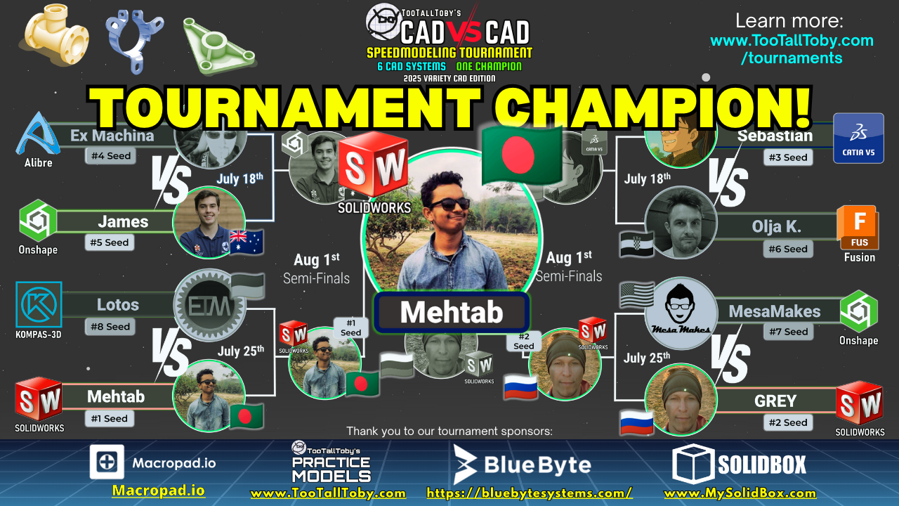 Each year we gather the FASTEST 3D CAD USERS from around the world to battle it out - 1 VS 1 - in a single elimination bracket style tournament to determine who is the FASTEST 3D CAD SPEEDMODELER!